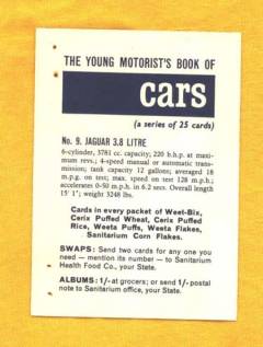 (1962) Young Motorist Book of Cars 25 numbered cards, measuring 92mm x 66mm. Note card front has no border. Album (pictured) was available. |