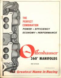 1968 Offenhauser catalog 8 ½ x 11 inches by 136 pages. Company history, illustrated intake manifold applications, valve covers, multiple carburetor linkage, air cleaners, carburetor adapters, engine adapters, more. Excellent used condition. Stock number Lit-1081. Price $65.00 |