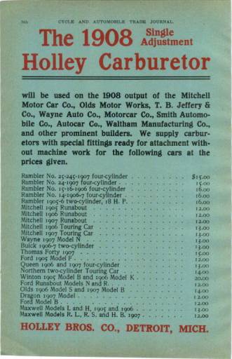 Autolite | Carter | Detroit | Ensign | Holley | Kingston | Linkert | Marvel | Motorcraft | Rayfield | Rochester | Schebler | Stromberg | Tillotson