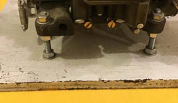 Street Eldon, Missouri 65026 Home | History | F.A.Q. | Orders | Contact Us | SELL TO US Carburetors | Repair Kits | Other Parts | Literature | Tools | Articles | Troubleshooting | Carburetor Identification Passenger Kits | Truck Kits | Tractor Kits | Industrial Kits | Marine Kits | Multi-carb set-ups Car Comics | Car Records | Car Trading Cards | Subscription Cards | Oakland and Pontiac Carburetor stands Some folks seem to think all they need to rebuild their carburetor is: the carburetor, a rebuilding kit, a few tools, and a bucket of evil-smelling liquid a.k.a. carburetor cleaner. I am going to suggest another requirement, equally important as any of the above.......................a carburetor stand. So why do I need a carburetor stand? There are many reasons, of which I will list a few. (1) safety - the stand acts as a third hand to help you hold the carburetor during disassembly. You are much less likely to have a screwdriver slip on a greasy screw, and perforate your hand, requiring a trip to the emergency road and a tetanus shot. (2) Ease of adjustment - with the carburetor off the workbench, all of the throttle linkage, fast idle linkage, choke linkage, etc. will function with ease, and final adjustments are easily made. (3) do no damage - one of the most important reasons to use a stand is to do no damage to the carburetor. On virtually all carburetors, at least some of the carburetor (throttle arm(s), choke housing, fast idle linkage, etc. extends BELOW the mounting surface of the carburetor. Virtually all carburetor throttle arms are pressed on to a flat surface of the throttle shaft, and some of the metal of the shaft is peened or staked over the arm to hold it in position. Ever see a carburetor with a loose throttle arm? And hear someone blame an offset throttle linkage? Ever think about the side tension applied to the arm by setting the carburetor on the work bench with no stand, and trying to disassemble the carburetor? Quite possible to loosen the arm where brass is the material of the shaft, bend the arm if the shaft is steel, or even bend the throttle shaft if a slab type shaft. Much more likely that loose linkage arm was caused by some previous "rebuilder" not using a stand, than by an offst throttle pull. Simply using a carburetor stand eliminates these issues. History The first carburetor stand of which I am personally aware are the individual chrome-plated steel legs introduced by Carter in the early 1950's.